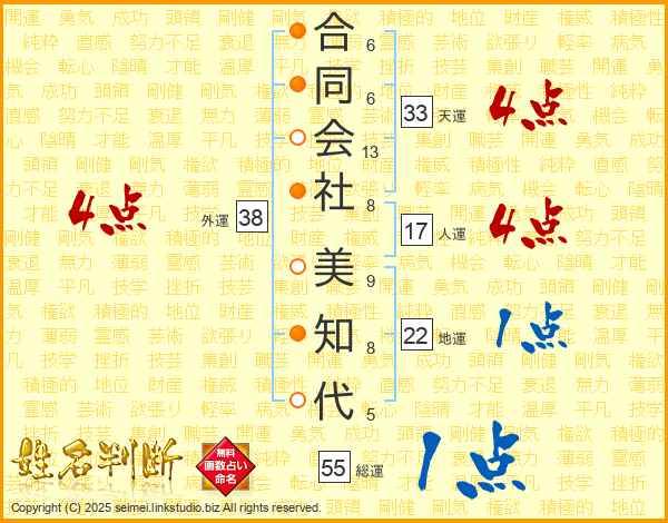 あなたの人生を表す1番重要な運勢です。生涯を通じて影響する総合運となり、主に50歳以降の晩年期に影響を及ぼします。苗字と名前の合計画数。