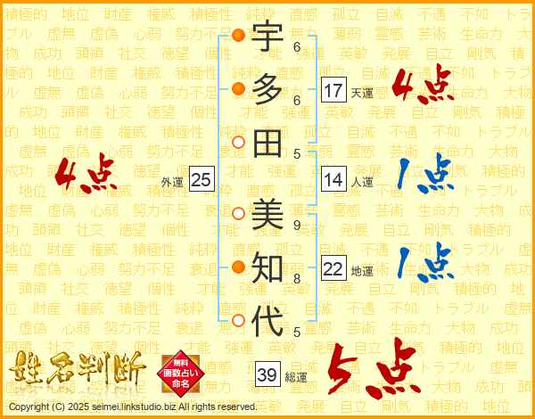 宇(6画)多(6画)田(5画) 美(9画)知(8画)代(5画)