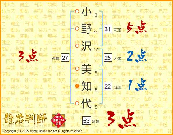 小(3画)野(11画)沢(17画) 美(9画)知(8画)代(5画)
