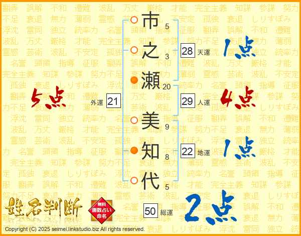 市(5画)之(3画)瀬(20画) 美(9画)知(8画)代(5画)