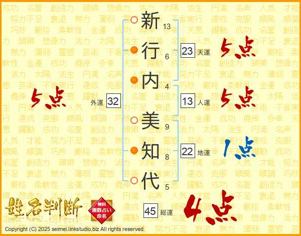 生活面を象徴する運勢です。外部から受ける影響力を表し、結婚運、家庭運や職場、環境への順応性を表します。総運から人運を引いた画数。姓や名が1文字の場合を除く。