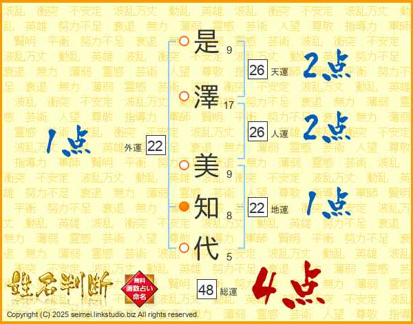 是(9画)澤(17画) 美(9画)知(8画)代(5画)