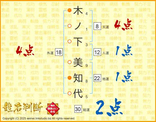 生活面を象徴する運勢です。外部から受ける影響力を表し、結婚運、家庭運や職場、環境への順応性を表します。総運から人運を引いた画数。姓や名が1文字の場合を除く。