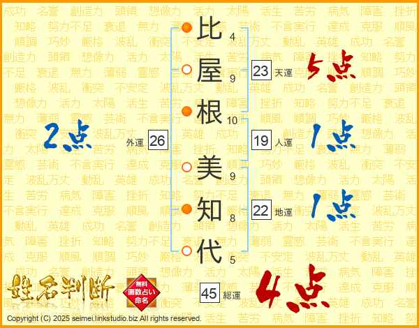 比(4画)屋(9画)根(10画) 美(9画)知(8画)代(5画)
