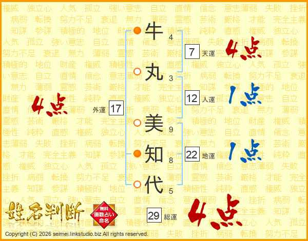 牛(4画)丸(3画) 美(9画)知(8画)代(5画)