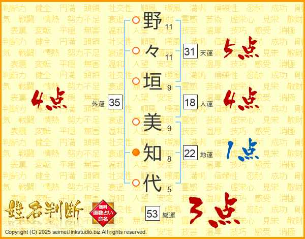 野(11画)々(11画)垣(9画) 美(9画)知(8画)代(5画)
