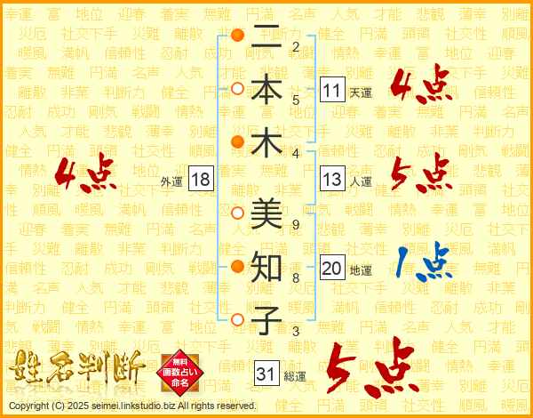 生活面を象徴する運勢です。外部から受ける影響力を表し、結婚運、家庭運や職場、環境への順応性を表します。総運から人運を引いた画数。姓や名が1文字の場合を除く。