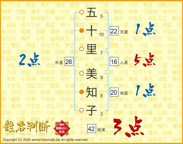 五(5画)十(10画)里(7画) 美(9画)知(8画)子(3画)