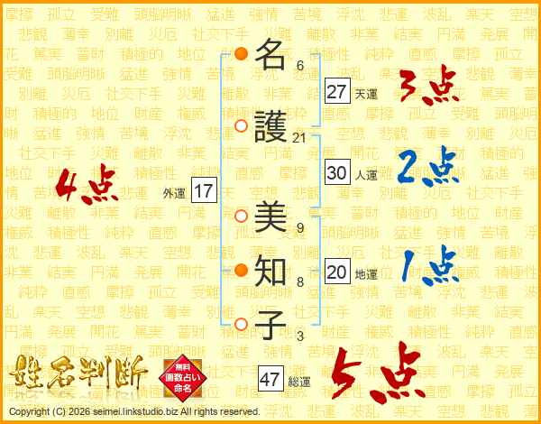 名(6画)護(21画) 美(9画)知(8画)子(3画)