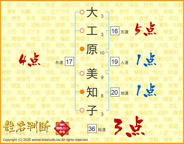 大(3画)工(3画)原(10画) 美(9画)知(8画)子(3画)