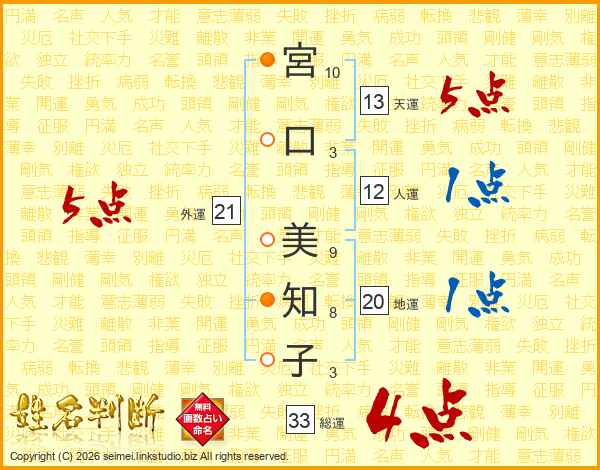 宮(10画)口(3画) 美(9画)知(8画)子(3画)