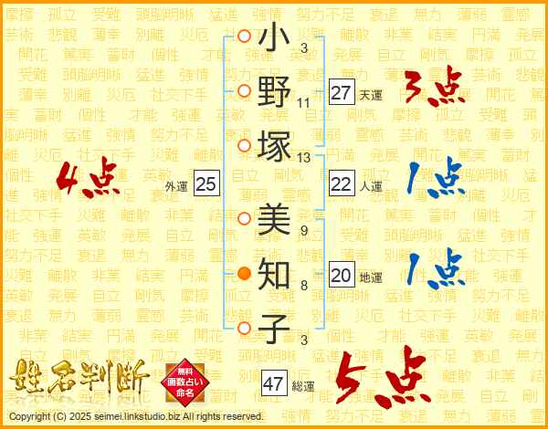 小(3画)野(11画)塚(13画) 美(9画)知(8画)子(3画)