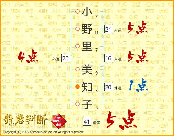 小(3画)野(11画)里(7画) 美(9画)知(8画)子(3画)