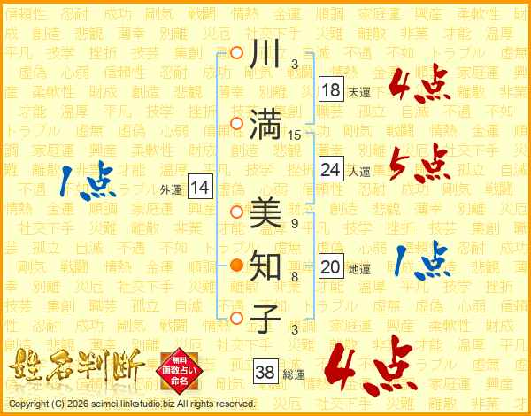 川(3画)満(15画) 美(9画)知(8画)子(3画)