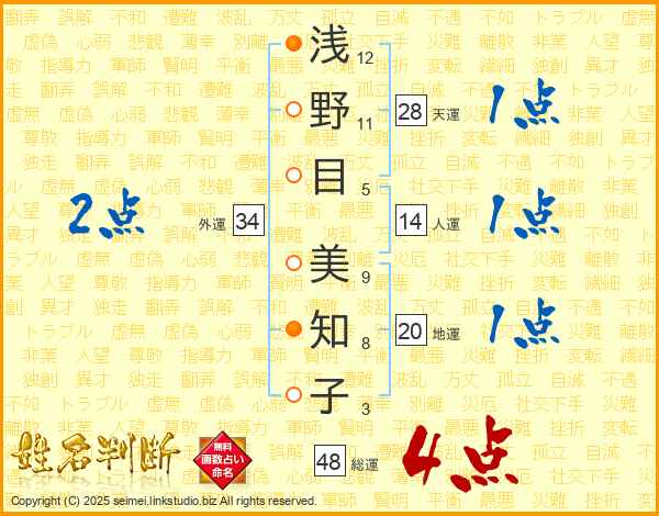 浅(12画)野(11画)目(5画) 美(9画)知(8画)子(3画)