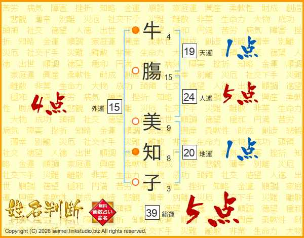 牛(4画)膓(15画) 美(9画)知(8画)子(3画)