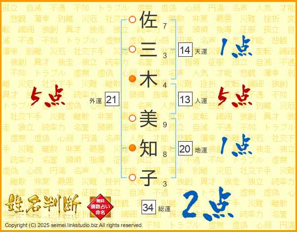 佐(7画)三(3画)木(4画) 美(9画)知(8画)子(3画)