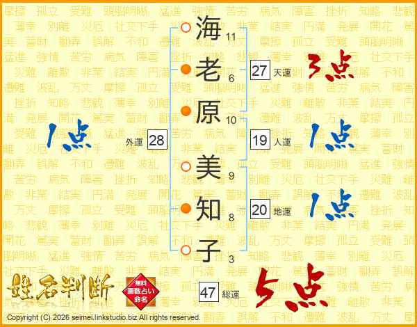 海(11画)老(6画)原(10画) 美(9画)知(8画)子(3画)