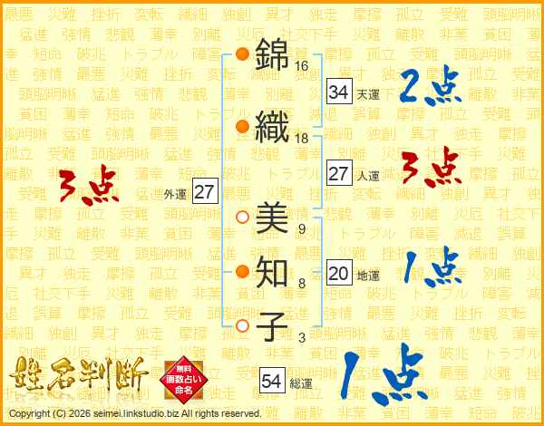 錦(16画)織(18画) 美(9画)知(8画)子(3画)