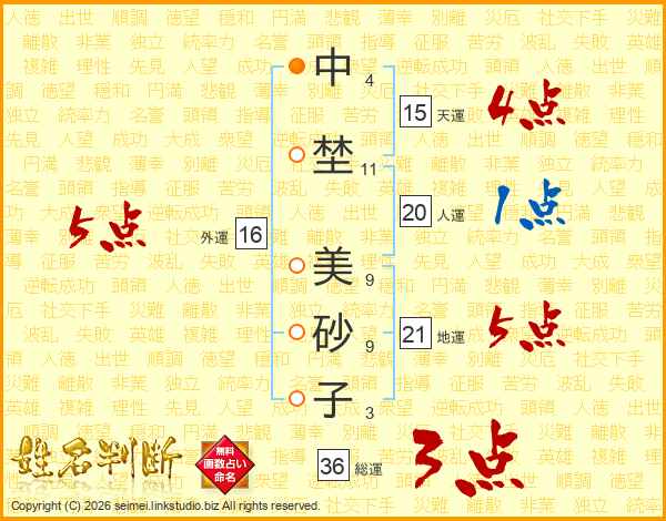中(4画)埜(11画) 美(9画)砂(9画)子(3画)