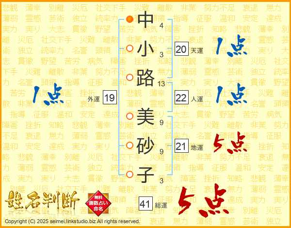中(4画)小(3画)路(13画) 美(9画)砂(9画)子(3画)