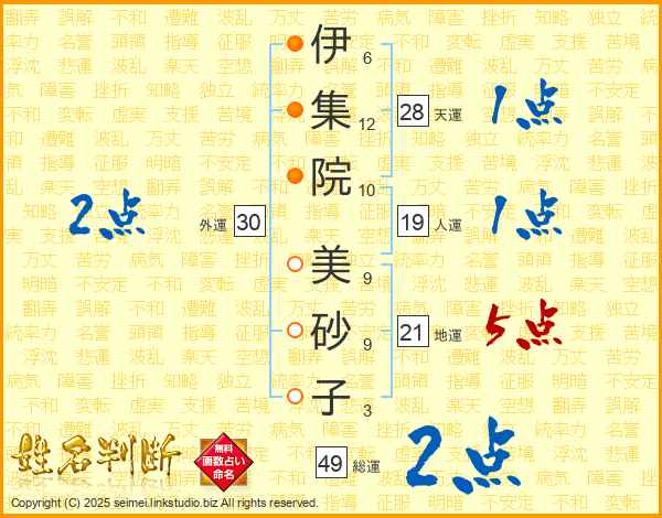 伊(6画)集(12画)院(10画) 美(9画)砂(9画)子(3画)