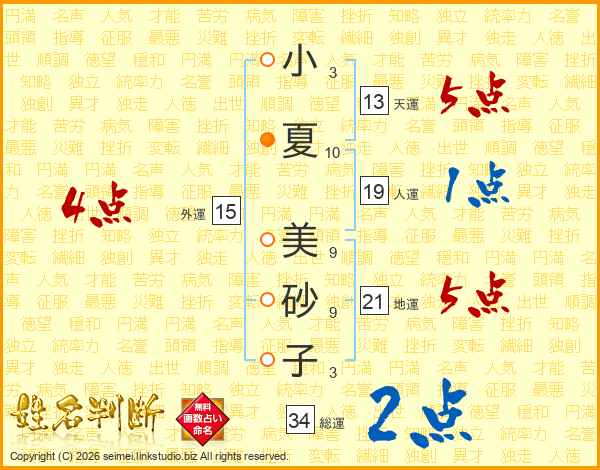小(3画)夏(10画) 美(9画)砂(9画)子(3画)