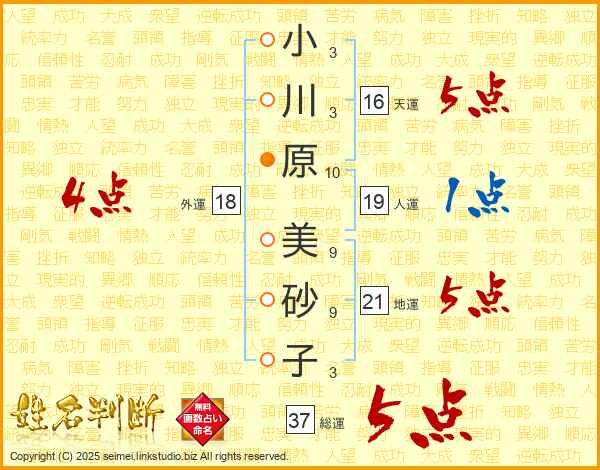 小(3画)川(3画)原(10画) 美(9画)砂(9画)子(3画)