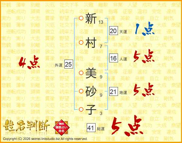 新(13画)村(7画) 美(9画)砂(9画)子(3画)