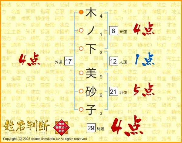 木(4画)ノ(1画)下(3画) 美(9画)砂(9画)子(3画)