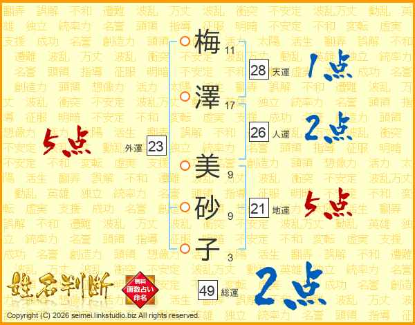 梅(11画)澤(17画) 美(9画)砂(9画)子(3画)