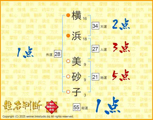 横(16画)浜(18画) 美(9画)砂(9画)子(3画)