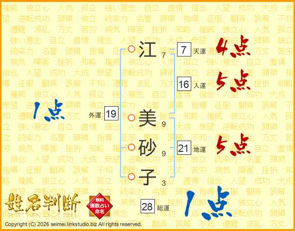 江(7画) 美(9画)砂(9画)子(3画)