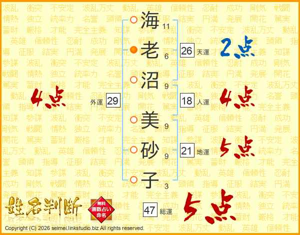 海(11画)老(6画)沼(9画) 美(9画)砂(9画)子(3画)