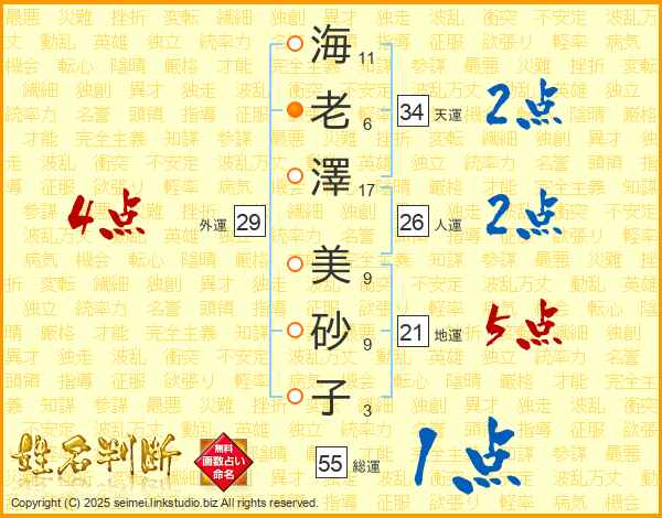 海(11画)老(6画)澤(17画) 美(9画)砂(9画)子(3画)