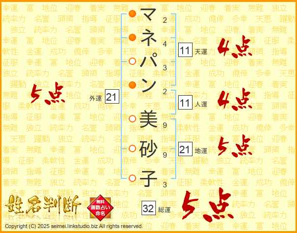 マ(2画)ネ(4画)パ(3画)ン(2画)  美(9画)砂(9画)子(3画)