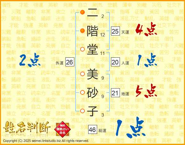 二(2画)階(12画)堂(11画) 美(9画)砂(9画)子(3画)