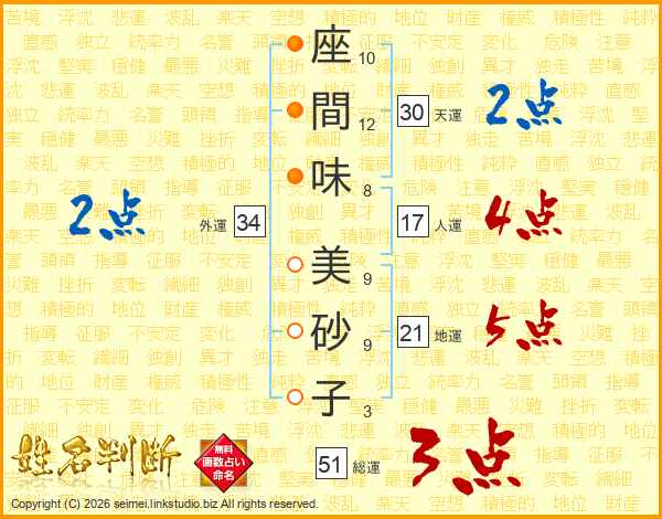 座(10画)間(12画)味(8画) 美(9画)砂(9画)子(3画)