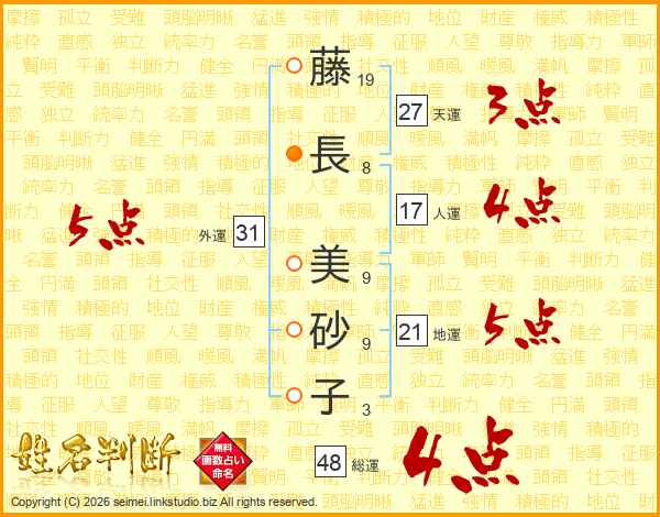 藤(19画)長(8画) 美(9画)砂(9画)子(3画)