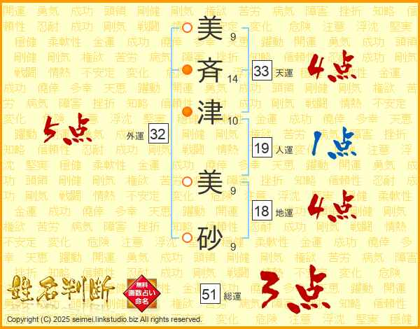 美(9画)斉(14画)津(10画) 美(9画)砂(9画)