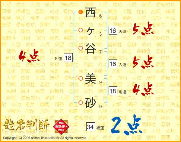 西(6画)ヶ(3画)谷(7画) 美(9画)砂(9画)