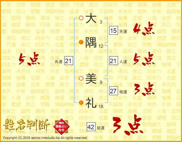 あなたの人生を表す1番重要な運勢です。生涯を通じて影響する総合運となり、主に50歳以降の晩年期に影響を及ぼします。苗字と名前の合計画数。