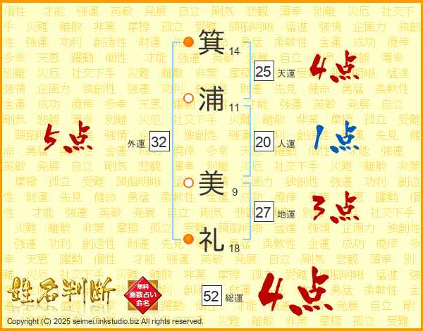 箕(14画)浦(11画) 美(9画)礼(18画)