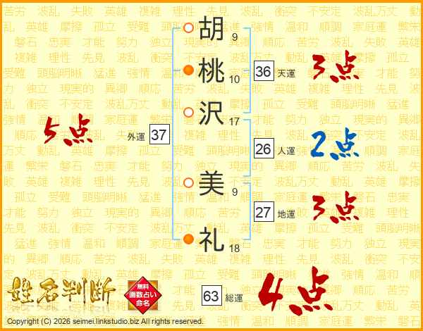 胡(9画)桃(10画)沢(17画) 美(9画)礼(18画)