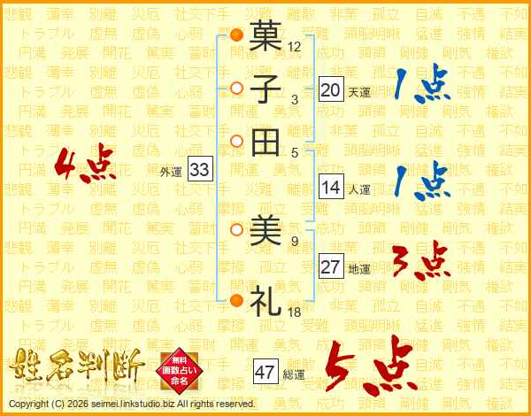 菓(12画)子(3画)田(5画) 美(9画)礼(18画)