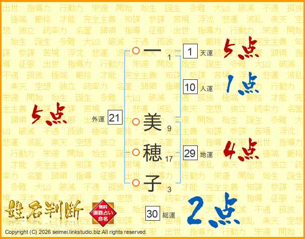 生活面を象徴する運勢です。外部から受ける影響力を表し、結婚運、家庭運や職場、環境への順応性を表します。総運から人運を引いた画数。姓や名が1文字の場合を除く。