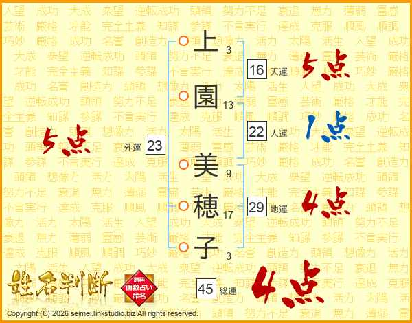 上(3画)園(13画) 美(9画)穂(17画)子(3画)