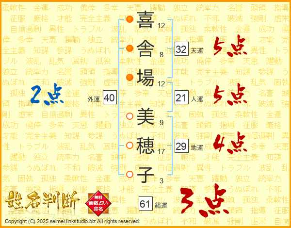 喜(12画)舎(8画)場(12画) 美(9画)穂(17画)子(3画)
