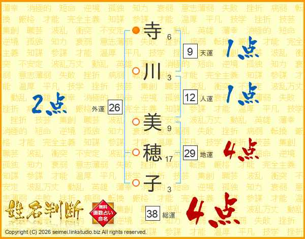 寺(6画)川(3画) 美(9画)穂(17画)子(3画)