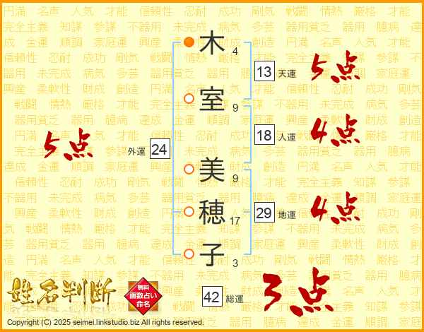 木(4画)室(9画) 美(9画)穂(17画)子(3画)